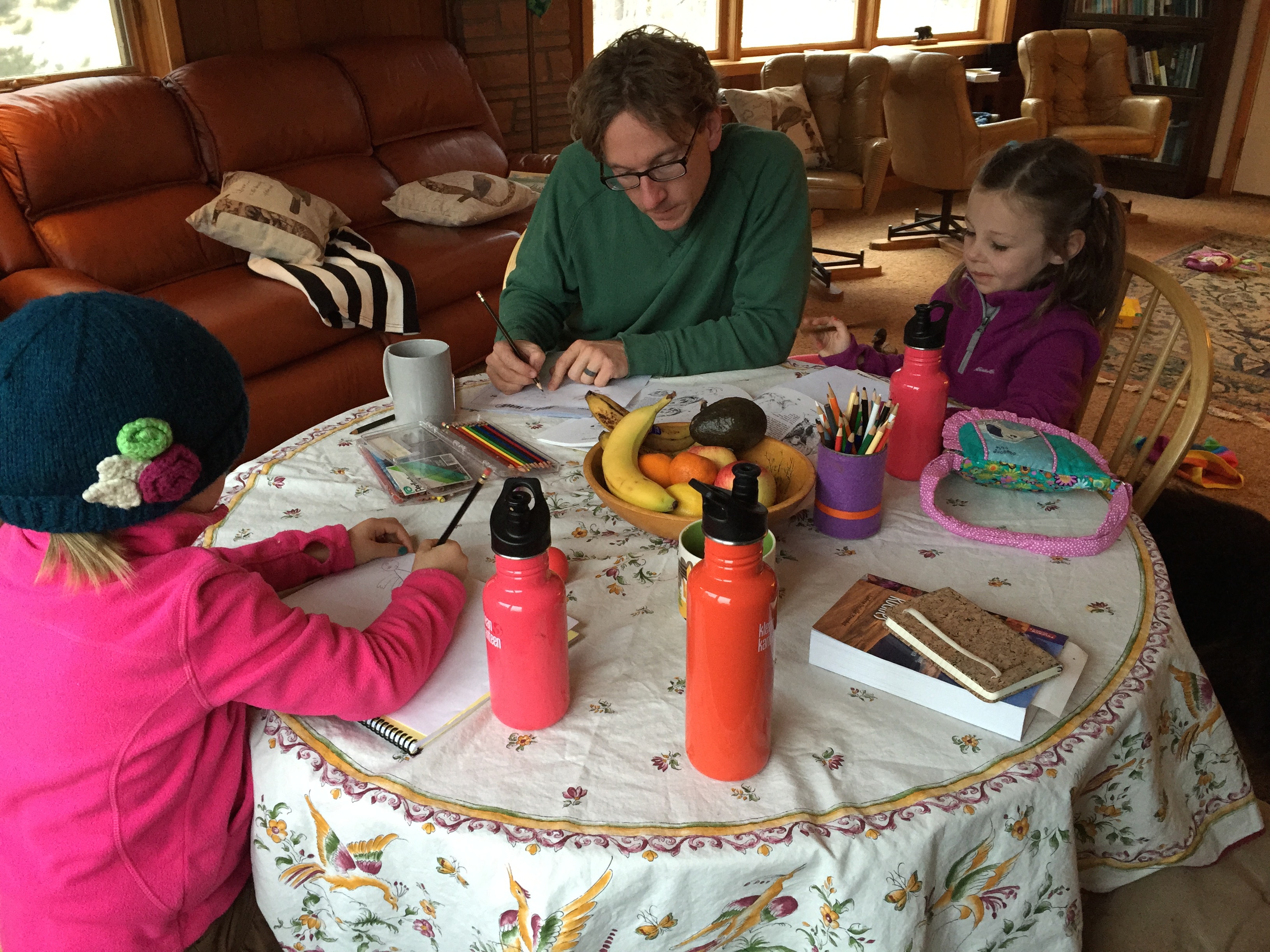 There was a beautiful, seamless rhythm to the week- the girls created the most imaginative games and “worlds” together, were truly thrilled to head out into the woods for hours every day–even with gusts of 50-70mph one day! Stephen and I had wonderful talks together, truly enjoying one another without distraction and we totally geeked out reading natural science books. We diagramed the mountain ranges and various rivers and the ecosystems, we flipped through bird books to identify that unusual yellow bird (grosbeak) that came to our ledge.